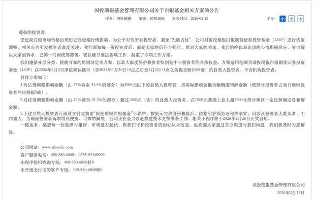 2月15日晚间,国投瑞银基金公告称,将对受国投白银LOF估值调整影响的投资者进行补偿,遵循分层分类、便捷可靠的原则制定本方案,以最大限度保护投资者特别是中小投资者的合法权益。方案适用范围为国投瑞银白银期货证券投资基金(LOF)以2026年2月2日净值确认赎回(含2026年1月30日15点之后至2月2日15点之前提交赎回申请)的自然人投资者,不含机构投资者。具体方案: